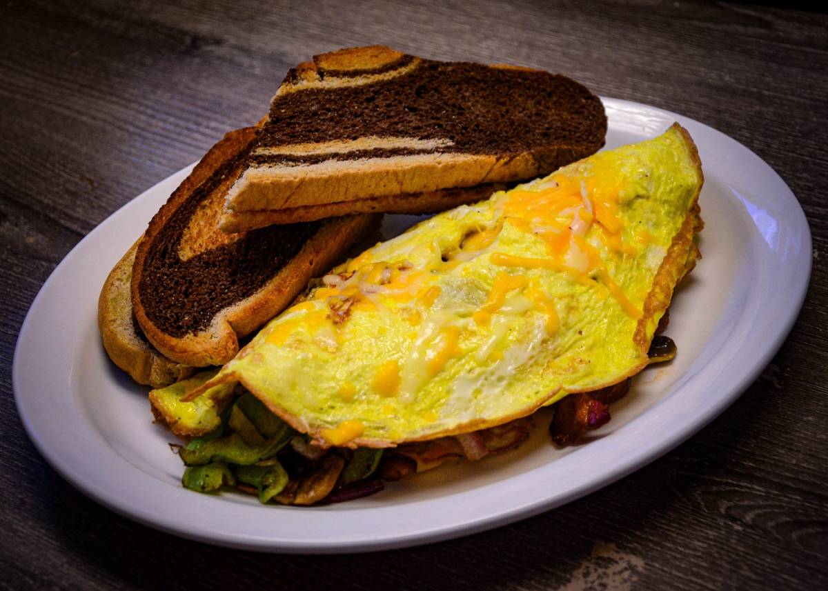 Choice of 1 cheese – feta, cheddar, Swiss, or goat cheese. Choice of 1 meat – ham or bacon. Choice of 3 veggies – spinach, mushrooms, tomatoes, onions, and green peppers. Choice of toast.